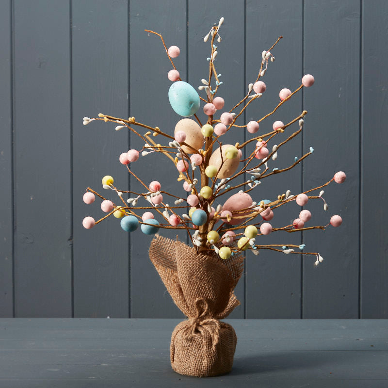 Our vibrant spring weeping tree is full of colourful eggs, nice branches and a beautiful hessian base tied with hessian string. A bright addition to your home.